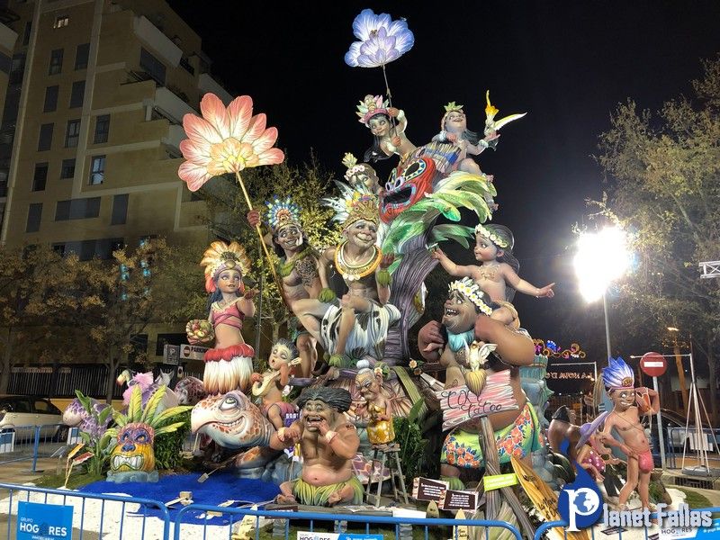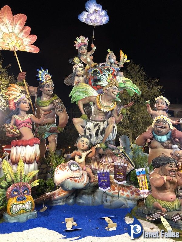 Fallas 2019 Grandes Fotos de la Falla Santa Genoveva Torres 2019, obra de David Sánchez Llongo Raúl Llibrer David Sánchez Llongo, Santa Genoveva Torres-Arquitecto Tolsá Artista: David Sánchez Llongo Lema: «Aloha» 4º Premio Sección 1ªA
